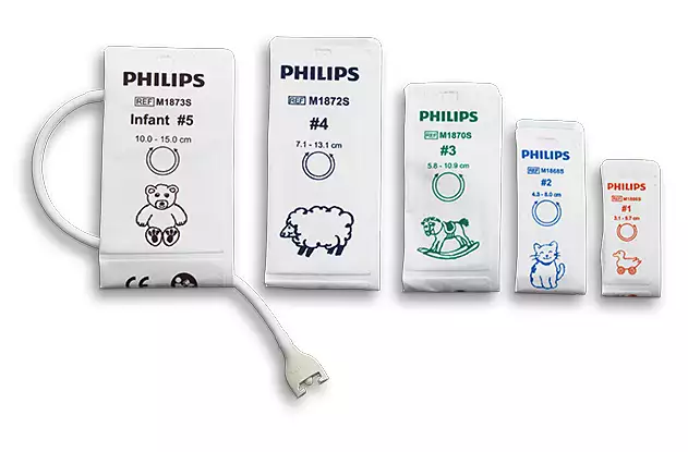 Neonatal Soft Single-Patient NIBP Kit contains 50 Cuffs: 5 M1866S Size#1, 10 M1868S Size#2, 20 M1870S Size#3, 10 M1872S Size#4, 5 M1873S Size#5. Incorporates new connector.